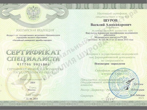 Психиатрическая клиника доктора Шурова имеет все необходимые лицензии и сертификаты. Это в очередной раз подтверждает, что мы работаем честно, прозрачно и открыто.